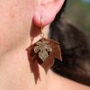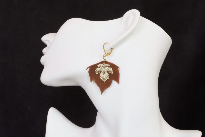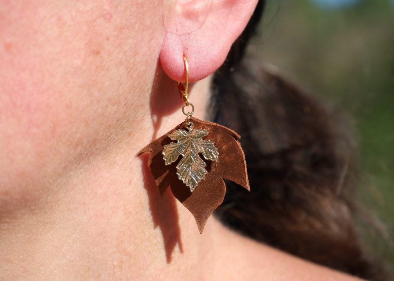 boucles d'oreilles feuille érable marron cuir nourri, cuir végétal, l'âge du cuir, maroquinerie artisanale, dordogne, france