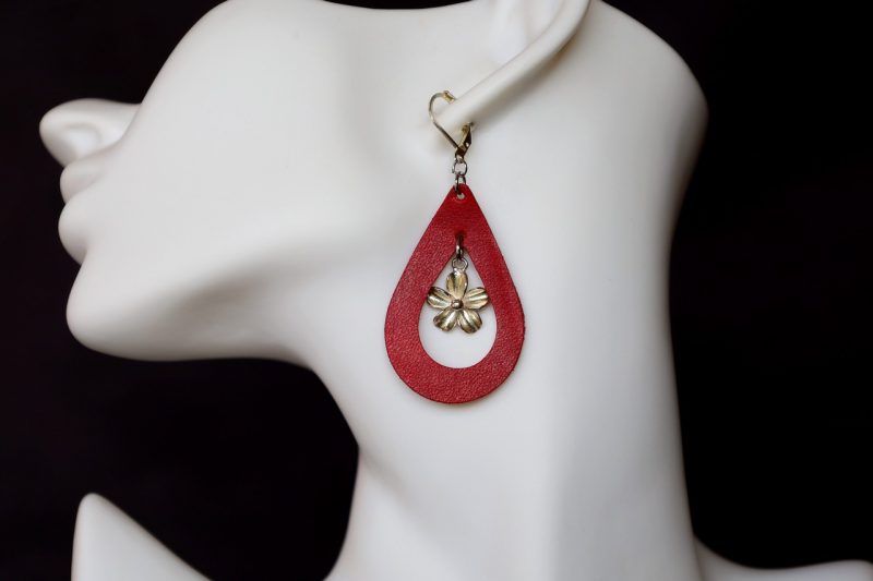 Ces boucle d’oreilles gouttes d’eau rouge pendantes et fleur sont réalisées dans notre atelier artisanal en Dordogne (France), dans une démarche Peau-éthique et responsable.