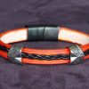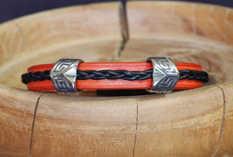 Le bracelet viking Brannrún est orné de cuir tressé et de deux perles coulissantes en inox.