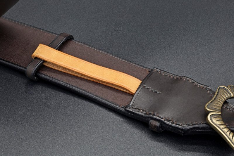 Sa particularité réside dans sa forme affinée : plus large dans le dos et plus étroite aux extrémités, elle crée une superposition harmonieuse de matière, à la fois esthétique et confortable. La boucle est cousue à la main au fil de lin ciré et au point sellier, dans le respect de la tradition.